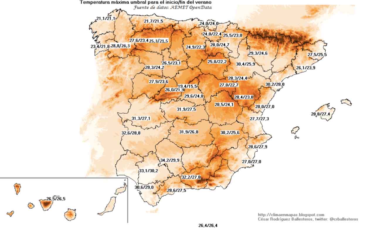 El meteorólogo de la AEMET César Rodríguez Ballesteros ha explicado en su blog personal cuál es la temperatura umbral en la que empieza el verano en 44 estaciones de España. Por ejemplo, en A Coruña el verano es a partir de los 21,1 ºC mientras que en Córdoba los 32,2 ºC ya son temperaturas máximas veraniegas. Al bajar de los 29,9 ºC de máxima acaba el verano en la ciudad andaluza.